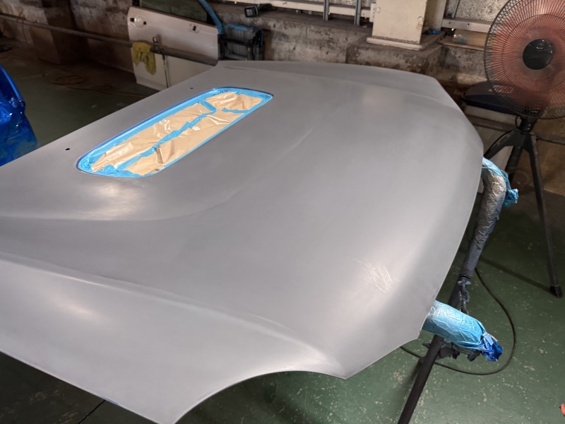 ボンネットは脱着ができるので、剥離剤と研磨のペーパーを用いて塗装を取ってからすぐサフェーサーを吹きました。
