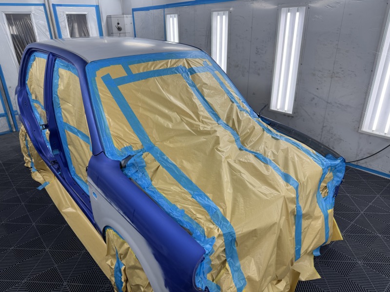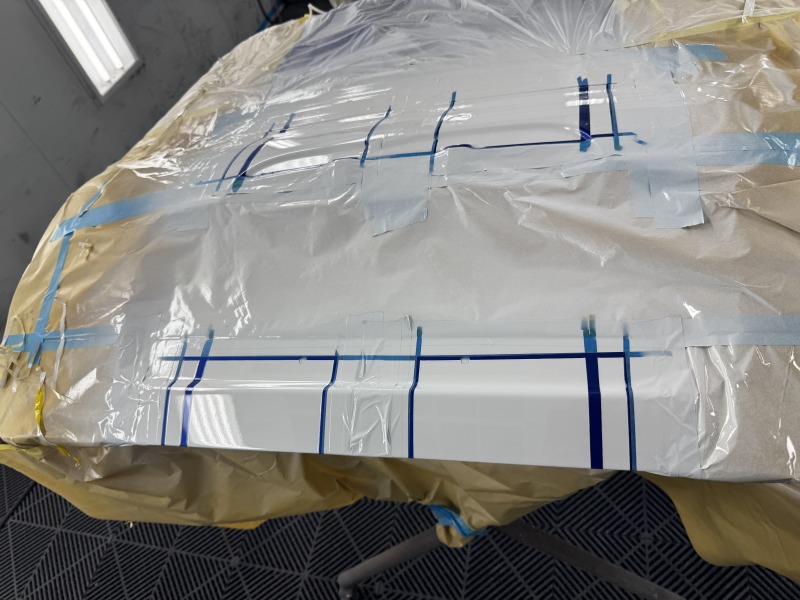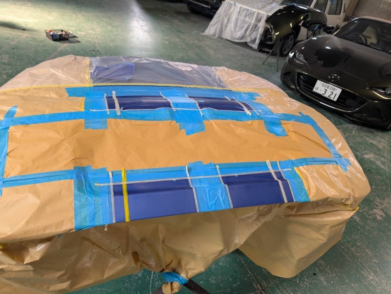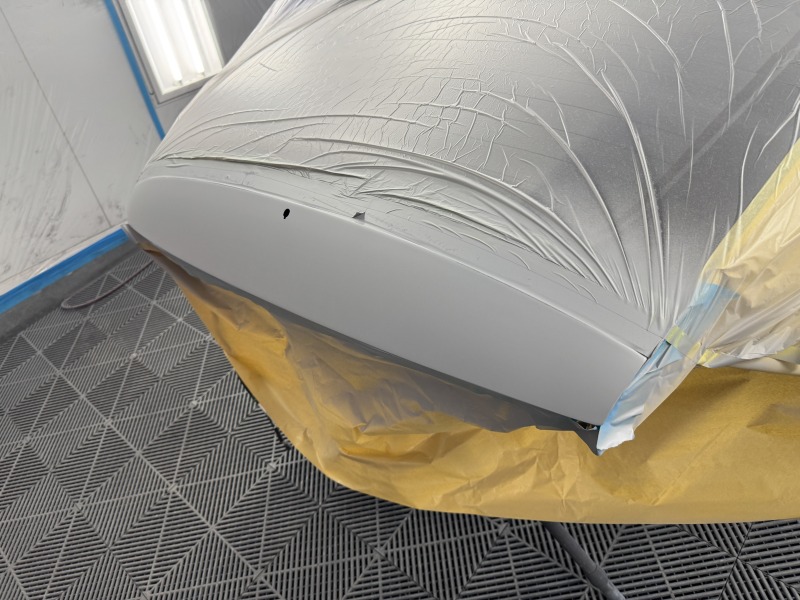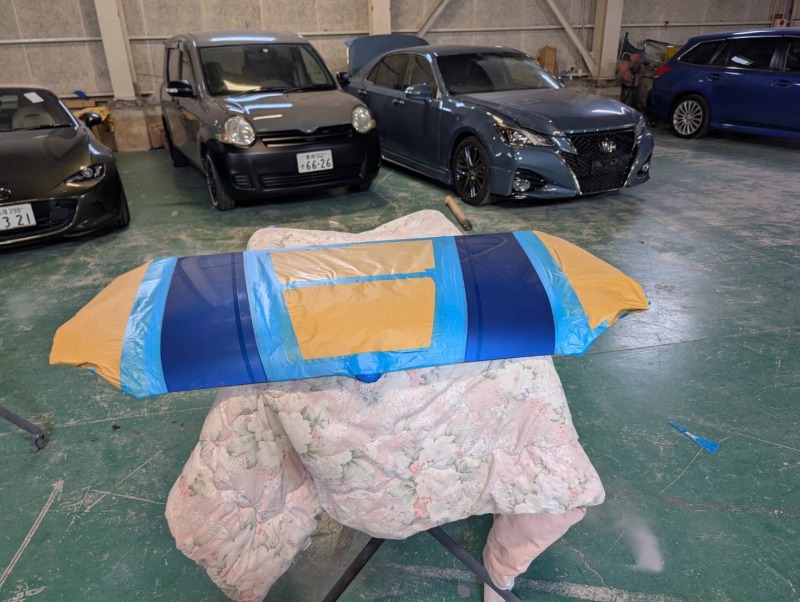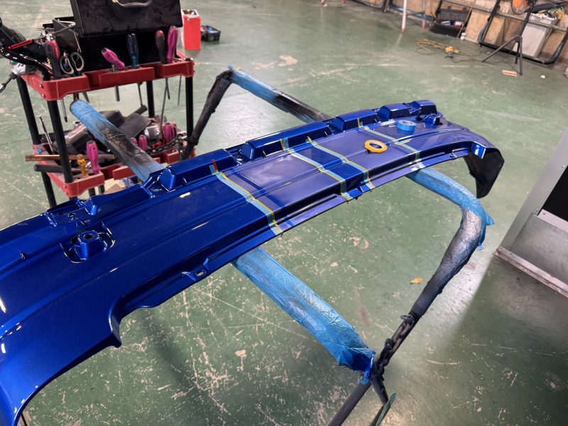 バンパーも同様にマスキングをし、塗装をしました。リアゲートの部分と位置がちゃんと合うように確認をしながらマスキングをしました。
