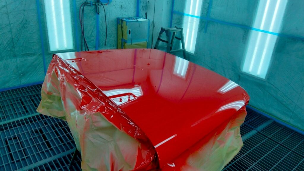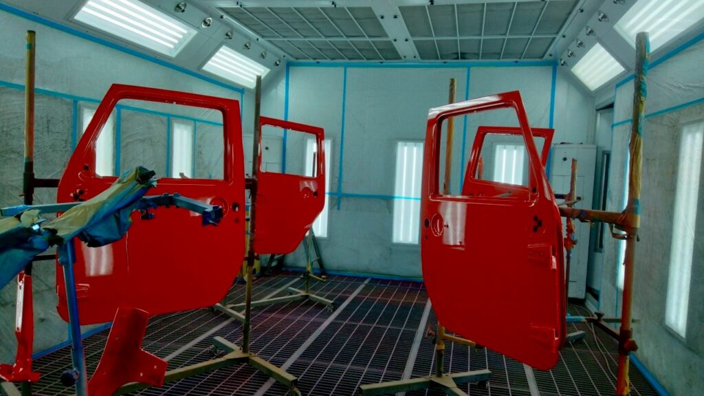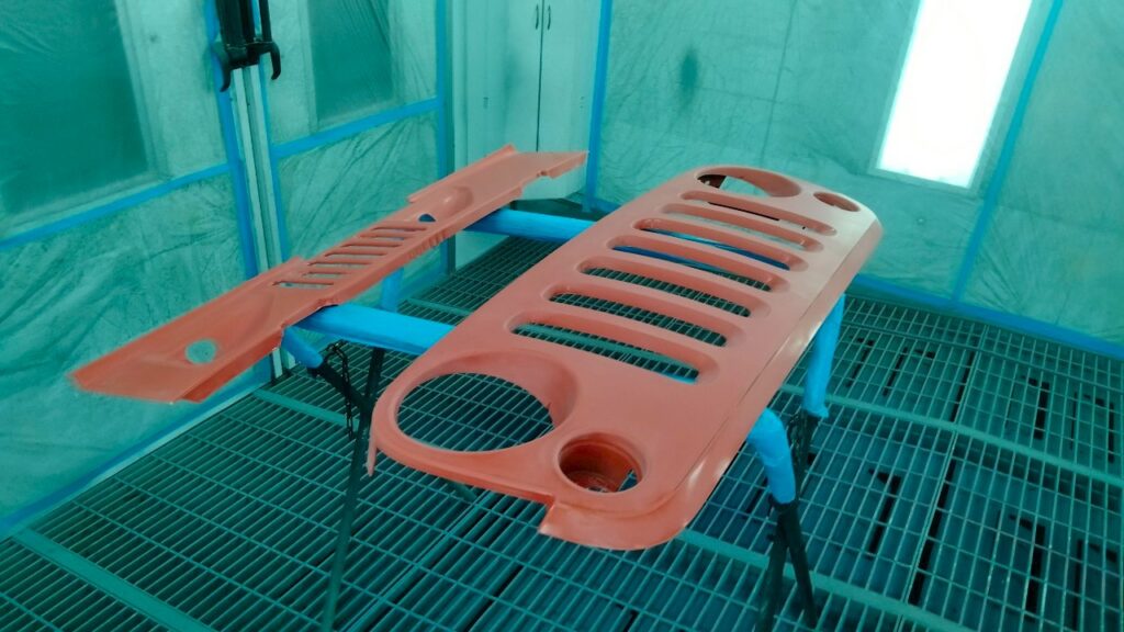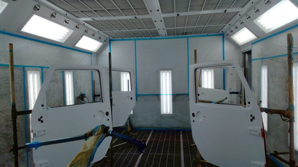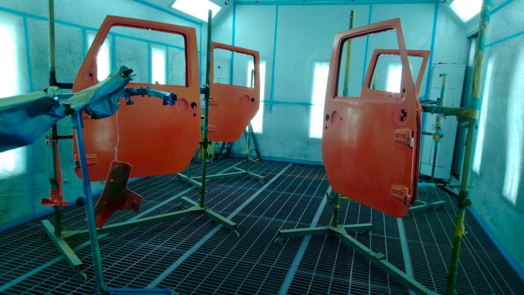 ドアなどの部品はこのように吊るして塗ると一気に塗ることができ、色のムラもなく塗ることができます。
