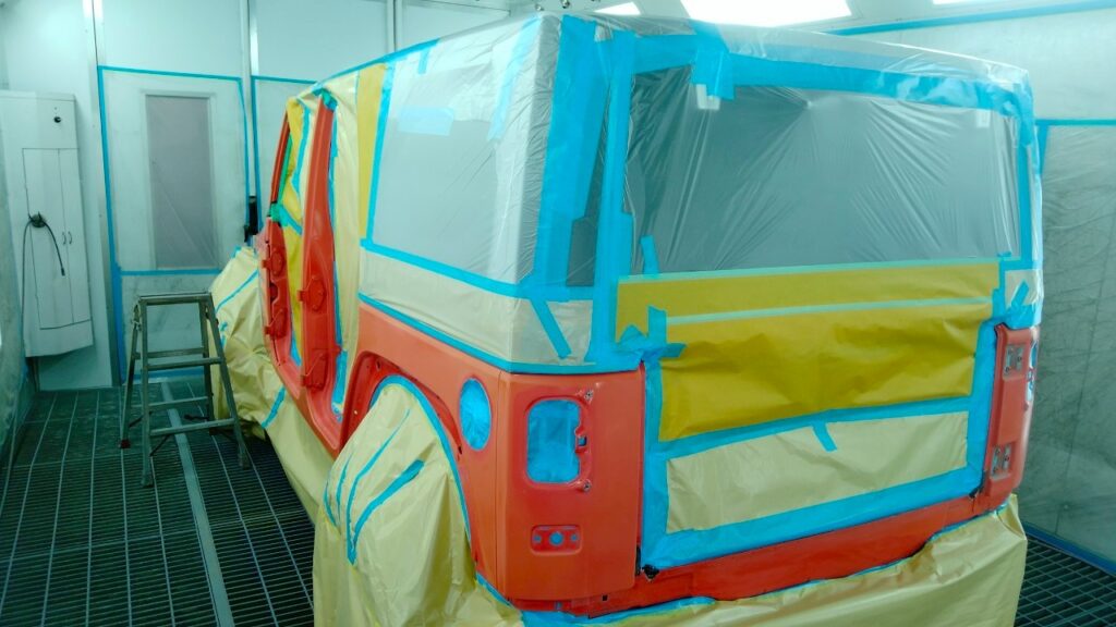 全塗装に必要な分解を終えたら、マスキングをしてボディー全体にサフェーサーを吹きます。